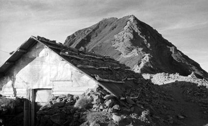 | (写真TOP)朝陽に輝く赤岳石室と赤岳 |