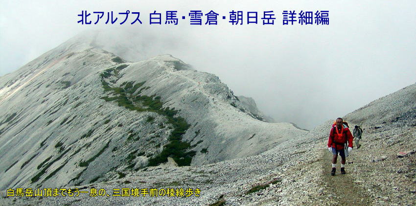 | 朝起きたら快晴!素早く朝食を取り、 出発。今日は風が無い。 暑くなりそうだが、朝日岳へ登り着く までは、まだ陽が当たらない。 朝日平から、白馬・雪倉が見える。 昨日来た、水平道分岐の鞍部からは、更に 視界が広がり、剣岳まで姿を現す。 |
