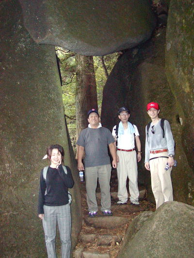 | 途中の茶屋で、つつじヶ丘コースと合流。 ここから人が一気に増える。 半数のメンバーは何をあせってか先行。 弁慶茶屋から先は、写真のような大岩が 点在している。 胎内潜りだの、裏大黒だの、北斗岩 だの…の、大岩。 足元にも岩が現れる。 目の前には、幼稚園生の団体。 グループに分かれて、大人が一歩で登る 岩も「よじ登る」って感じだ。 身体全体を使って登っている。 頂上までは、幼稚園生と一緒に歩く。 |