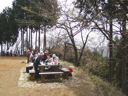 持ち寄った食料と酒類で、花の 無い「お花見」 花はなくとも酒はある。 15時まで、延々と大宴会は続く のであった。 下りは鳩ノ巣下山組とずぼら ケーブル組に分かれる。 |