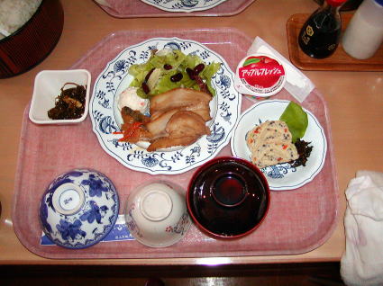 大皿にチョイチョイと盛り付けた一品ずつ。かなり薄い味噌汁。お茶も、時間をかけても殆ど白湯状態。2泊目はおでんが余分に付いた。横尾山荘の方が、やはり料理だった気がする。