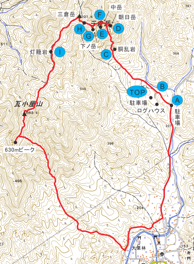 | 06:35自宅発→06:50五日市IC→07:10大竹IC→07:40〜45三倉平駐車場→07:49登山口→08:06五合目→08:13六合目→08:20七合目→08:28八合目→08:35朝日岳・中岳コル→08:40朝日岳→08:42コル→08:45天狗の踊場→08:52中岳→09:08〜27下ノ岳→09:30九合目小屋→09:35三倉岳山頂→10:00灯籠岩→10:15最低鞍部→10:40〜50瓦小屋山頂→11:03瓦小屋630m峰→11:05下山口→11:38山道→11:47集落→12:13〜20駐車場→12:50大竹IC→13:07五日市IC→13:25自宅着 |
