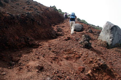 樹林が切れ始めると、道幅が広くなってお鉢に続く急な斜面が目の前に出てくる。